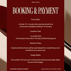 K8Ball Media Booking Policy Deposit to Secure Your Date A non-refundable 25% deposit is required to lock in your shoot date and time. This deposit is applied directly to your final invoice. Invoicing & Payment Terms Invoice Timing: Your final invoice will be sent as soon as your deposit is received. Due Date: Payment is due within two weeks after your session, or upon delivery of your images if they arrive sooner. Rescheduling & Cancellations Reschedule: No extra fees when you let us know at least 72 hours before your shoot. Cancel: Deposits are forfeited if cancelled 72+ hours before. Cancellations inside 72 hours forfeit the full deposit and may incur up to 50% of the remaining balance. Punctuality & No-Shows Please arrive on time—your session runs for the booked duration. Late arrivals (over 15 minutes) may shorten your shoot; extra time is billed at £50 per 15 min. No-shows forfeit their deposit and must rebook with a new deposit. Travel & Location Fees In-Studio Shoots: No extra charge. On-Location Shoots: Includes a 10-mile radius of Basingstoke. Beyond that, a £0.50/mile round-trip travel fee applies. Weather Policy (Outdoor Shoots) If conditions become unsafe or heavily rainy, we’ll reschedule at no extra cost. A final call is made 2 hours before your slot. Add-Ons & Extras Hair & Makeup: £25 for a 1-hour session / £100 for a full day. Extra Retouching: £20 per image beyond the two included. Usage Rights & Copyright Once full payment is received, you own the rights to your final images for personal or commercial use. K8Ball Media may feature selected images in our portfolio, social channels, or marketing (with credit). Have questions or need to chat? Reach out anytime: 📧 k8@k8ballmedia.co.uk | 🌐 k8ballmedia.co.uk | 📱 +44 7862 262 655 We can’t wait to create with you! 🎱✨